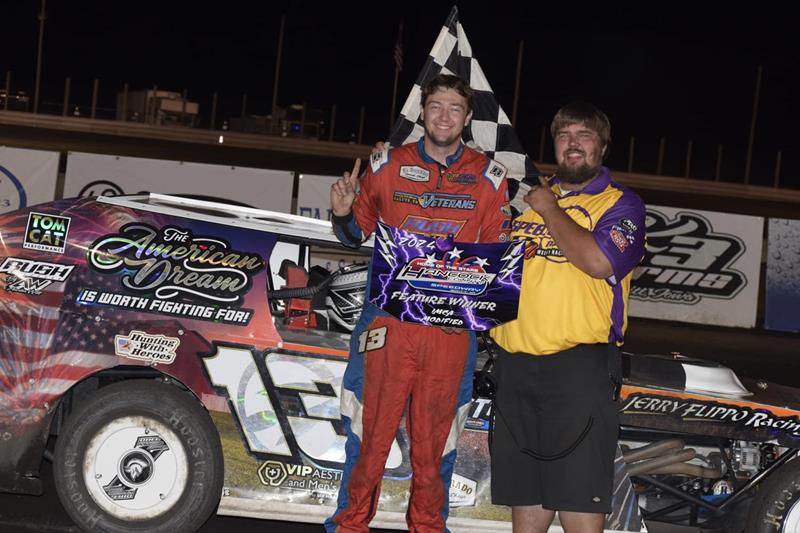Three different drivers were in the second position at different times of IMCA Modified feature, however Jerry Flippo left them all. Flippo, who has suffered through a summer of bad luck, finished the race more than a half track ahead of eventual second place driver Cody Knecht. Knecht charged from sixth to finish ahead of Clint Hatlested, and Jeremy Mills.
